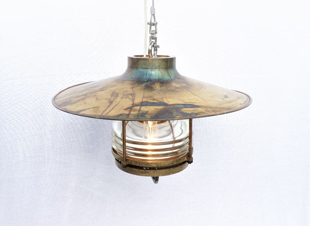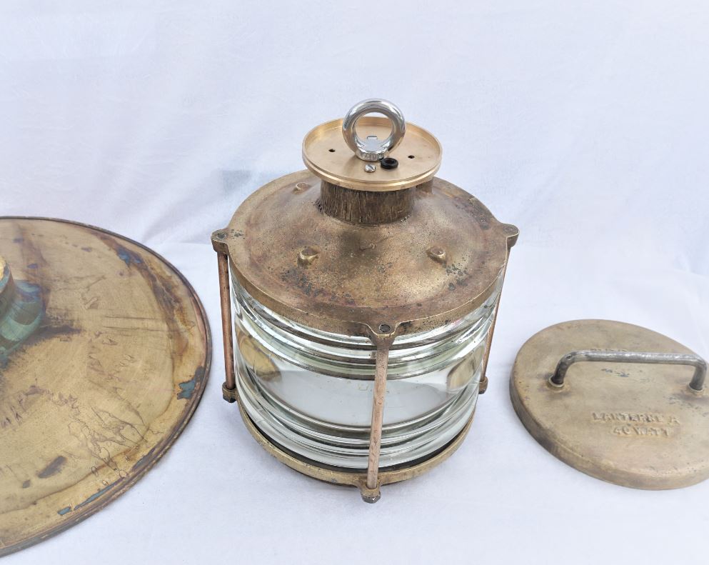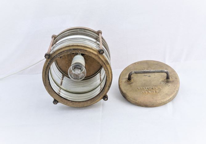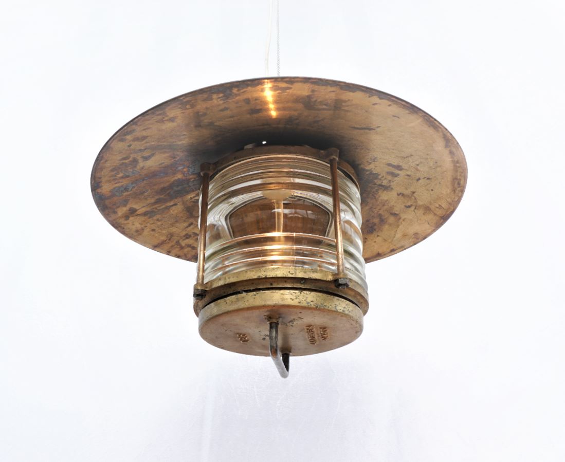 En gedigen og stor toplanterne med 360 graders præcisions-linse demonteret fra et ældre fartøj. Lanternen her er monteret med messing skærm og derved egnet som lampe over spisebord mm.
